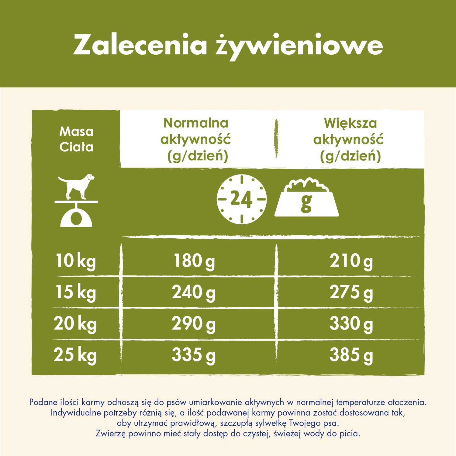 | Spodziewana masa ciała psa dorosłego | Normalna aktywność (g/24h) | 1 godz. aktywności (g/24h) | >3 godz. aktywności (g/24h) |