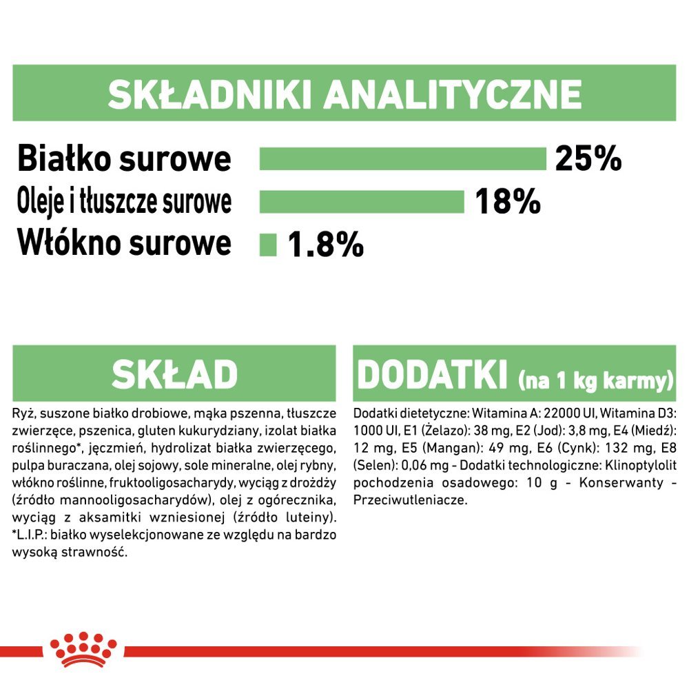 Dyskomfort trawienia nie jest przyjemny dla nikogo, również dla psa. Zdrowe jelita Twojego psa poza uczuciem komfortu, oznaczają również najlepsze wchłanianie składników odżywczych z pokarmu, co ostatecznie wspomaga dobre samopoczucie twojego psa. Karma ROYAL CANIN Digestive Care Medium jest odpowiednia dla psów powyżej 12 miesiąca życia o wrażliwym przewodzie pokarmowym, których masa ciała wynosi między 11 a 25 kg. Receptura tej specjalnie opracowanej diety z aktywnymi składnikami pokarmowymi zawiera zestaw prebiotyków sprzyjający prawidłowej florze bakteryjnej jelit. Prebiotyki są składnikami pokarmowymi koniecznymi do odżywienia mikroflory jelitowej, co odgrywa ważną rolę w utrzymaniu zdrowia całego przewodu pokarmowego. W firma Royal Canin wykorzystywane są tylko białka najwyższej jakości, dostosowane do szczególnych potrzeb danego psa.