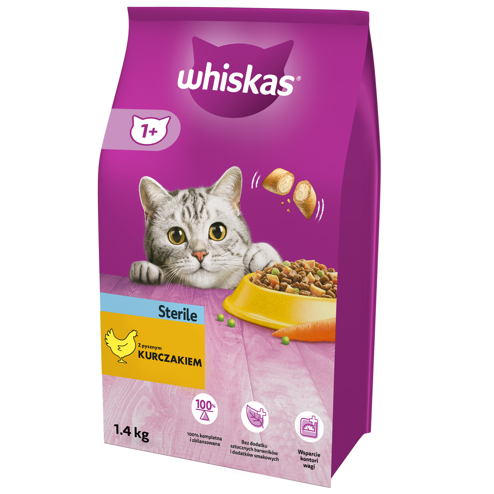 Koty po zabiegu sterylizacji i kastracji często mają specjalne potrzeby żywieniowe. WHISKAS Sterile 14 kg to sucha karma dla kotów po sterylizacji z kurczakiem, która uwzględnia te potrzeby. Obniżony poziom składników mineralnych przekłada się na ochronę dróg moczowych przed popularnymi schorzeniami, zwłaszcza kamicą. Niska wartość tłuszczu sprawia, że pokarm ma obniżoną kaloryczność, a przez to sprzyja utrzymaniu prawidłowej masy ciała kota. Prebiotyki wspierają prawidłowe trawienie i regularne wypróżnienia, co pomaga również w usuwaniu kul włosowych z układu pokarmowego. Specjalny kształt krokieta – a zwłaszcza jego twarda obwódka – w połączeniu z kompleksem składników gwarantują mechaniczne usuwanie osadu z zębów i wspieranie zdrowia dziąseł. Nienasycone kwasy tłuszczowe oraz cynk ułatwiają utrzymanie w zdrowiu skóry i powodują piękny wygląd sierści. Krokiety w karmie mają twardą otoczkę i miękkie wnętrze, zachęcające kota do spożycia całej porcji. Karma bytowa dla kotów sterylizowanych może być uzupełniona karmą mokrą tej samej marki.
